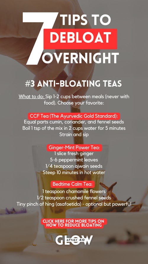 And if you add some ginger, it’ll speed up your stomach emptying by 25%, so your food doesn’t sit around fermenting. Peppermint’s cooling menthol stops digestive spasms, and chamomile calms your stress response. This is important because stress literally shuts down digestion and creates more bloating.