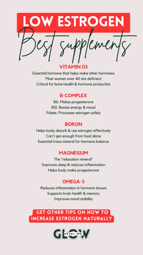 - Vitamin D3: Most women over 40 are deficient. Vitamin D isn’t just for bones – it’s actually a hormone that helps your body make other hormones. Test your levels first, but chances are you need more than you’re getting.