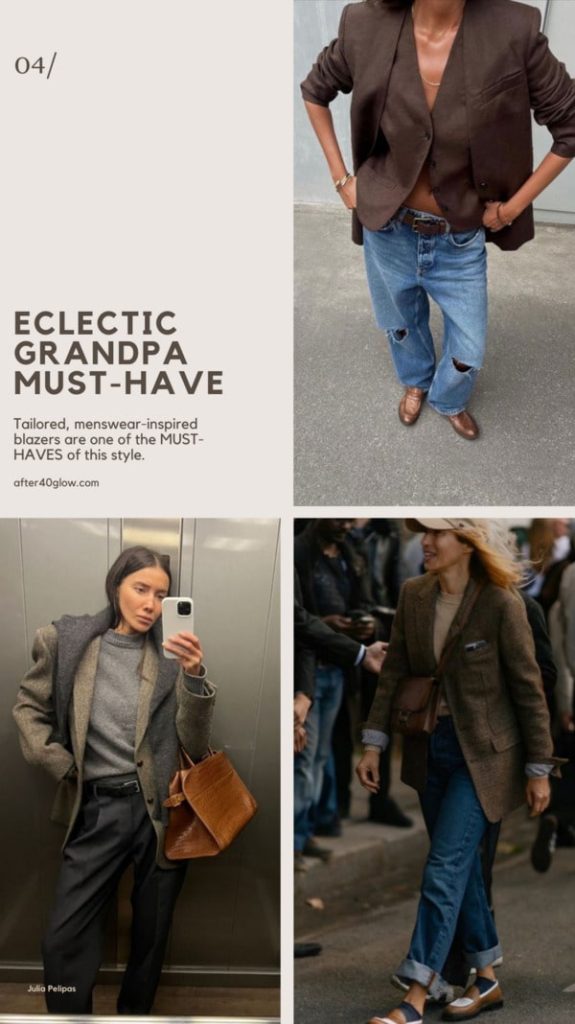 For an upscale take on grandpa chic, opt for a tailored, menswear-inspired blazer. Strong shoulders and a boxy shape provide structure, while fabrics like tweed or houndstooth add professorial flair.