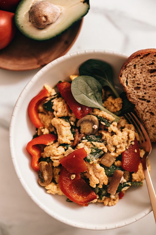 Instructions: Heat oil in pan, sauté vegetables until tender. Scramble eggs with vegetables, season to taste. Serve with avocado slices and toast.