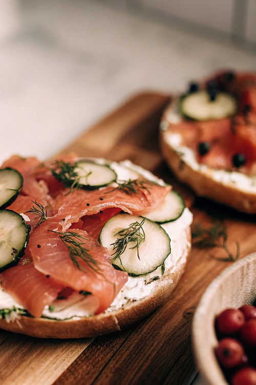 Instructions: Toast bagel, spread cream cheese, layer salmon, cucumber, capers, and dill. Serve with berries.