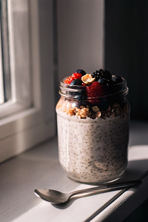 Instructions: Mix the chia seeds and milk together, then let sit for five minutes (or prepare the night before and refrigerate). Chop the other ingredients for the pudding, mix them in, and top with berries before serving.