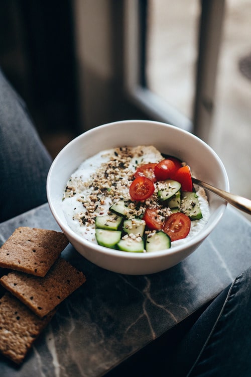 Instructions: Mix yogurt with half the seasoning. Top with cucumber, tomatoes, hemp hearts, and remaining seasoning. Drizzle with olive oil. Serve with crackers.
